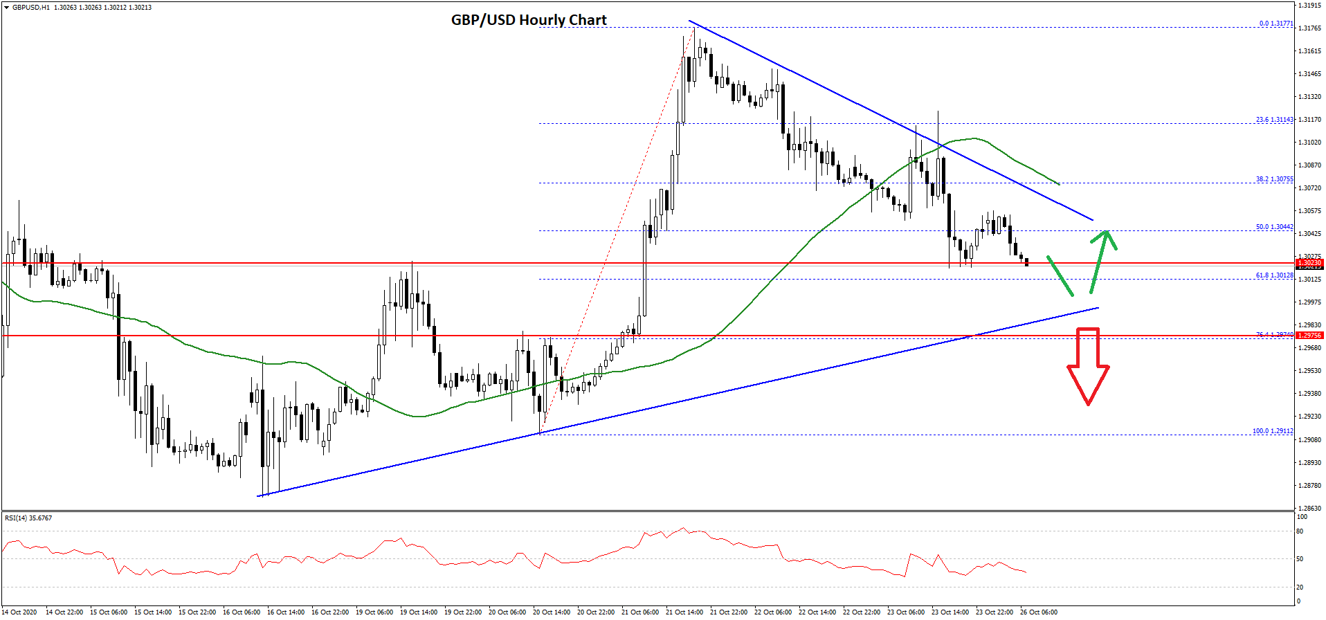 On the upside, the first major hurdles for the bulls is near the 1.3050 level. Moreover, there is a key bearish trend line forming with resistance near 1.3060 on the same chart. A clear break above 1.3050 and 1.3060 is needed for a fresh increase in the near term.