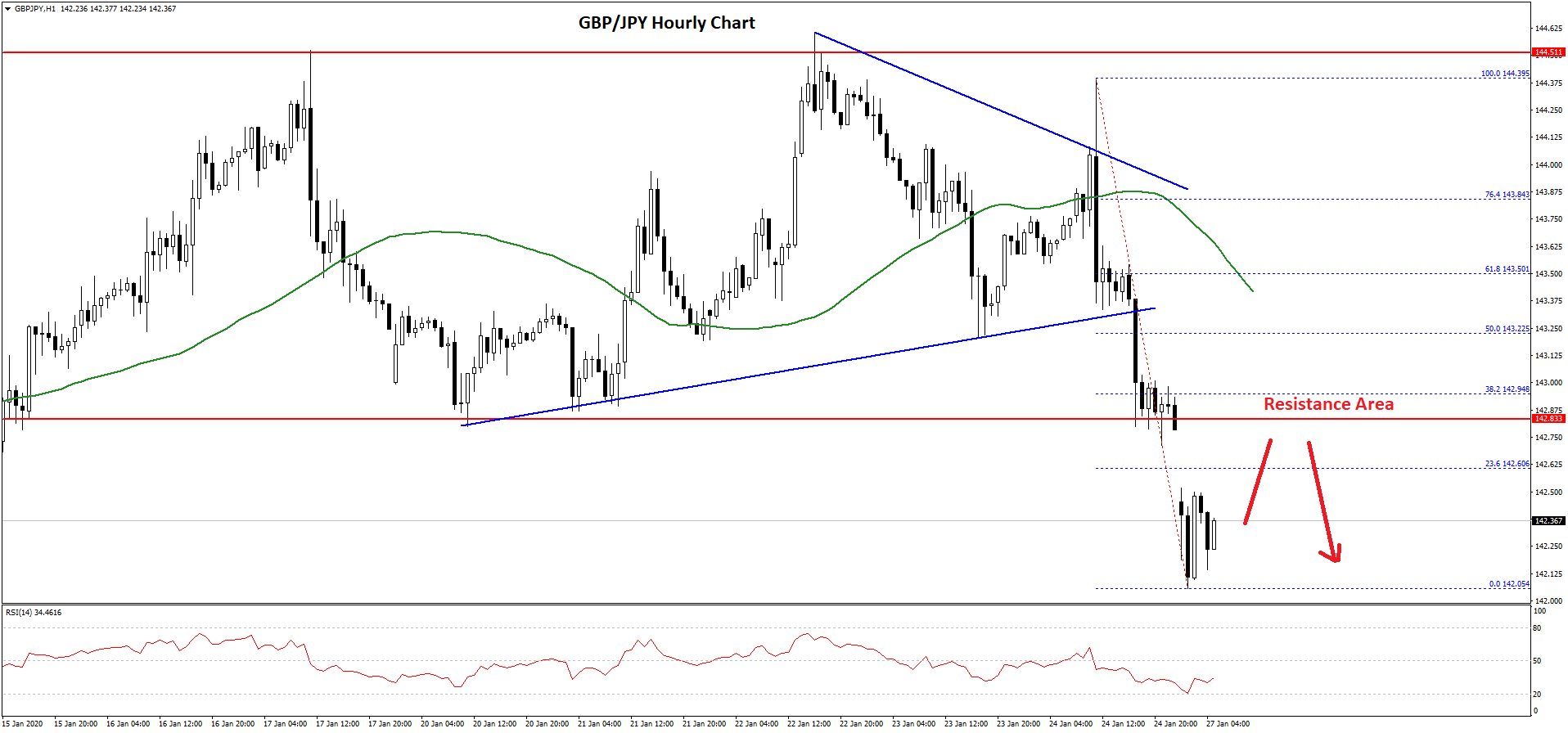 During the decline, there was a break below a key contracting triangle with support near 143.35 on the hourly chart. The pair settled below the 143.20 level and recently declined towards 142.00.