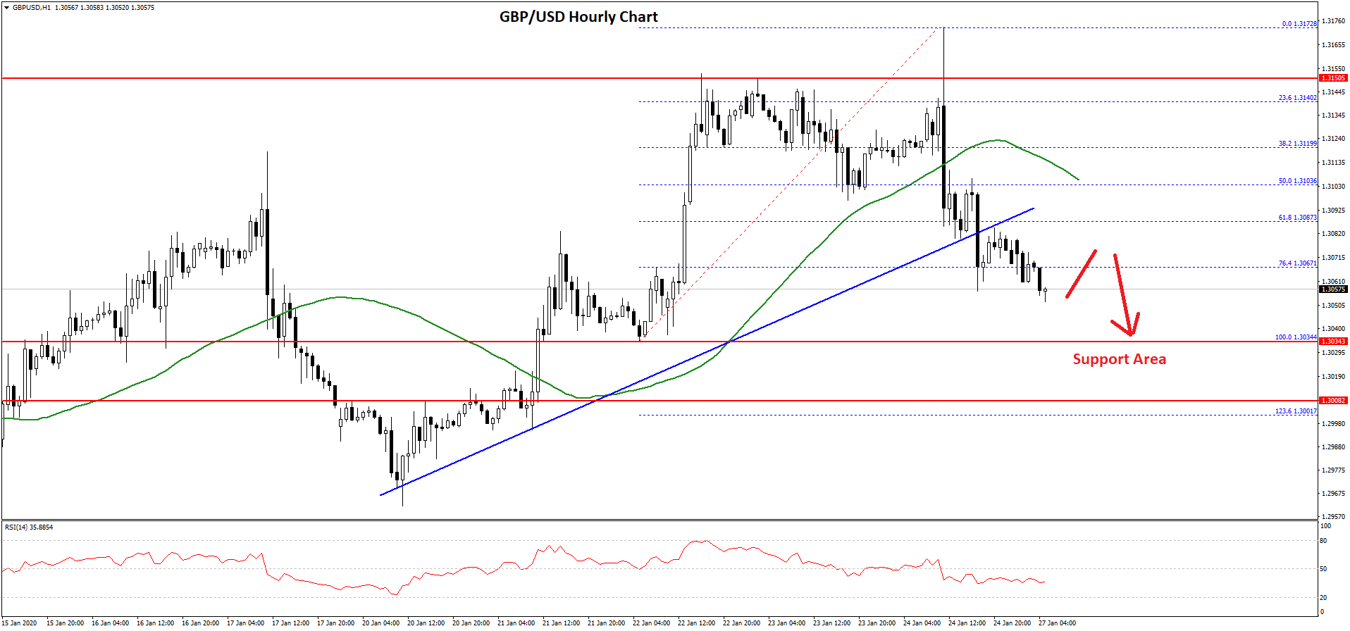 - There was a break below a major bullish trend line with support near 1.3085 on the hourly chart of GBP/USD.