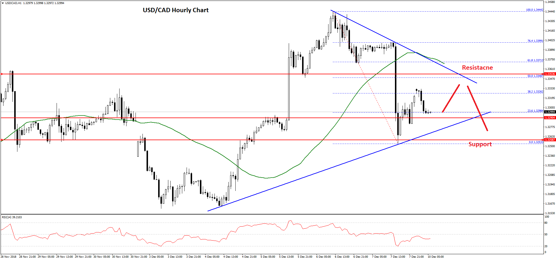 A high was formed near the 1.3444 level and later the pair corrected lower sharply. It declined below the 1.3350 and 1.3300 support levels. It tested the 1.3250 support and settled below the 50 hourly simple moving average.