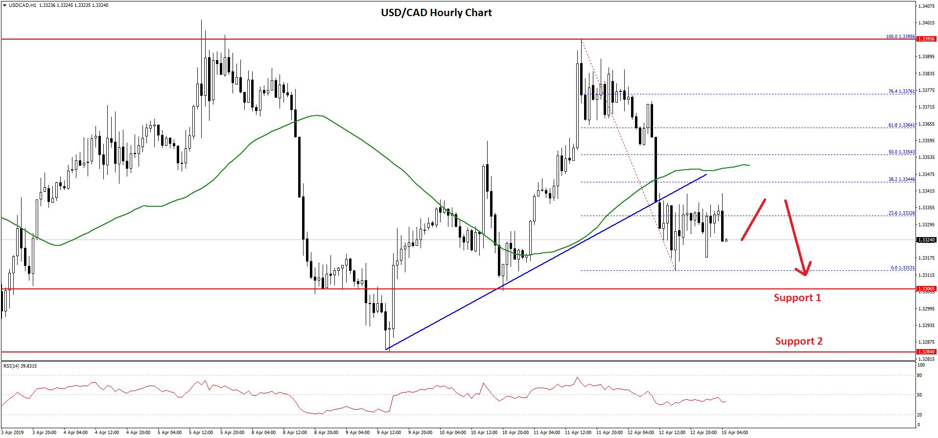 - USD/CAD declined recently and broke the key support near the 1.3350 level.