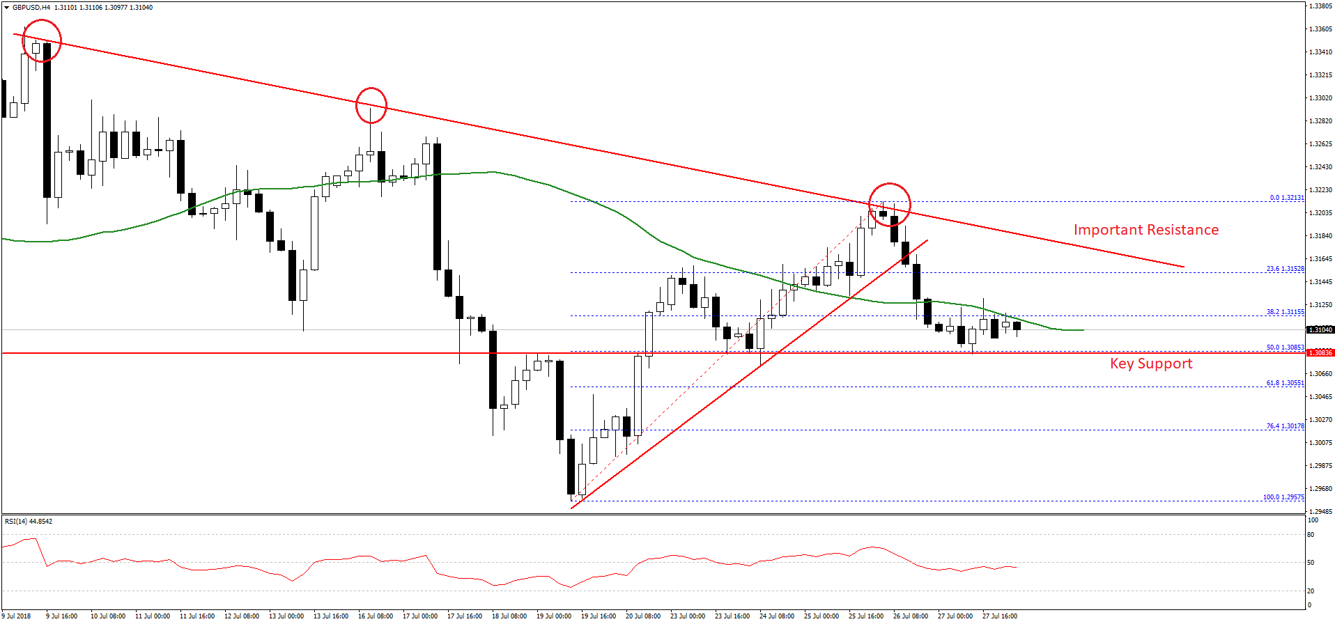 The pair even traded above the 1.3200 resistance and the 50 simple moving average (4-hour). However, buyers failed to hold gains above the 1.3200 level and the pair dipped towards 1.3100. During the decline, there was a break below a bullish trend line with support at 1.3180 on the 4-hours chart.