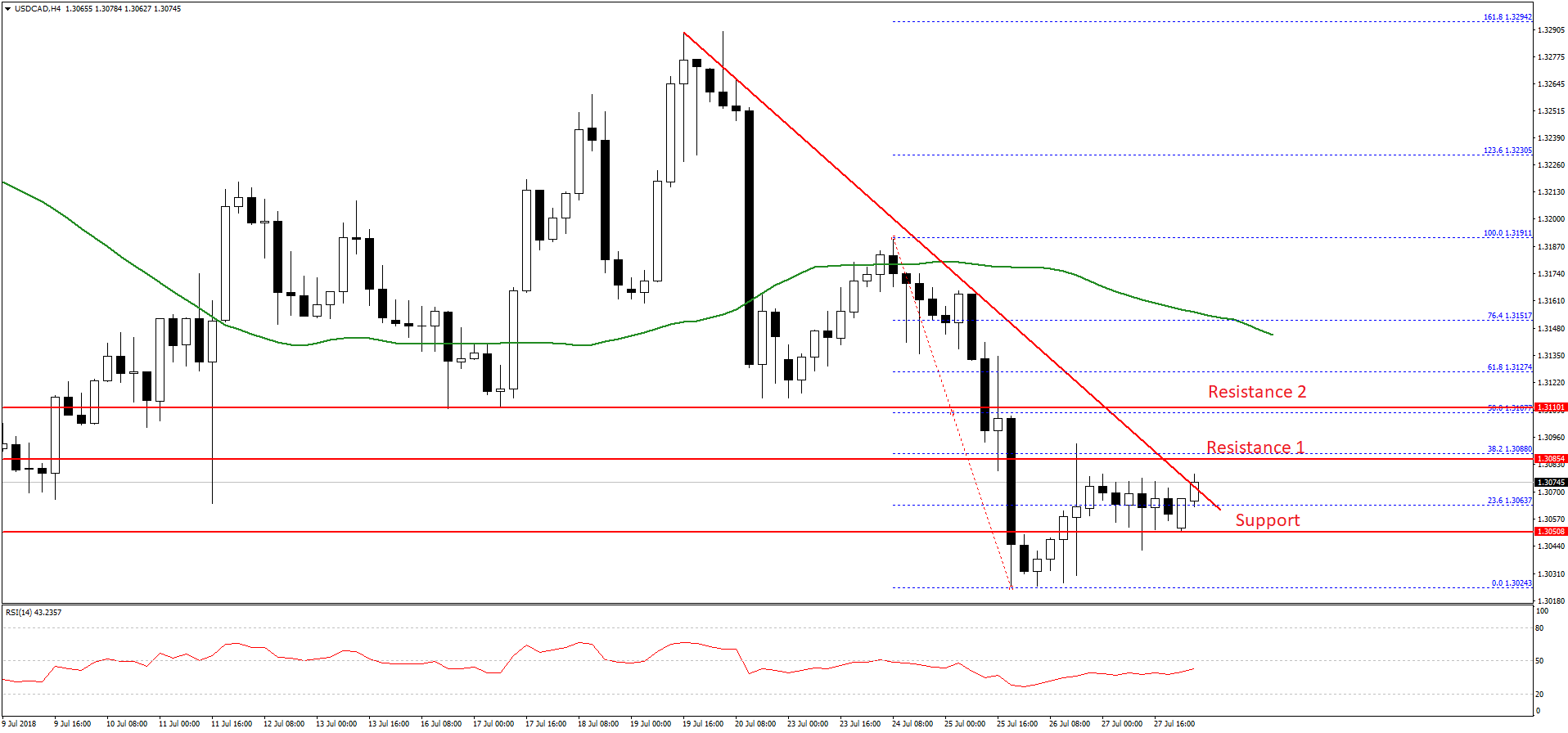 The US Dollar remained under a lot of bearish pressure below 1.3100 against the Canadian Dollar. The USD/CAD pair traded below the 1.3100 support area and settled below the 50 simple moving average (4-hour).