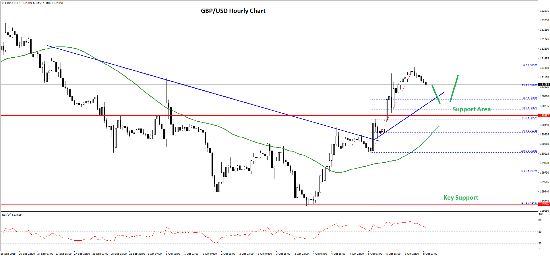 During the rise, the pair broke a key bearish trend line with resistance at 1.3025 on the hourly chart. There was also a spike above the 1.3100 level and the pair traded as high as 1.3132.