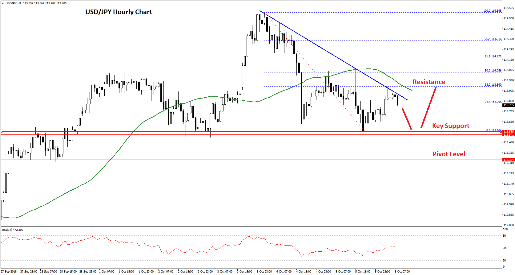 However, the pair found a strong support near the 113.55 level, which was a resistance earlier. It recovered recently and traded above the 23.6% Fib retracement level of the last drop from the 114.54 high to 113.56 low.