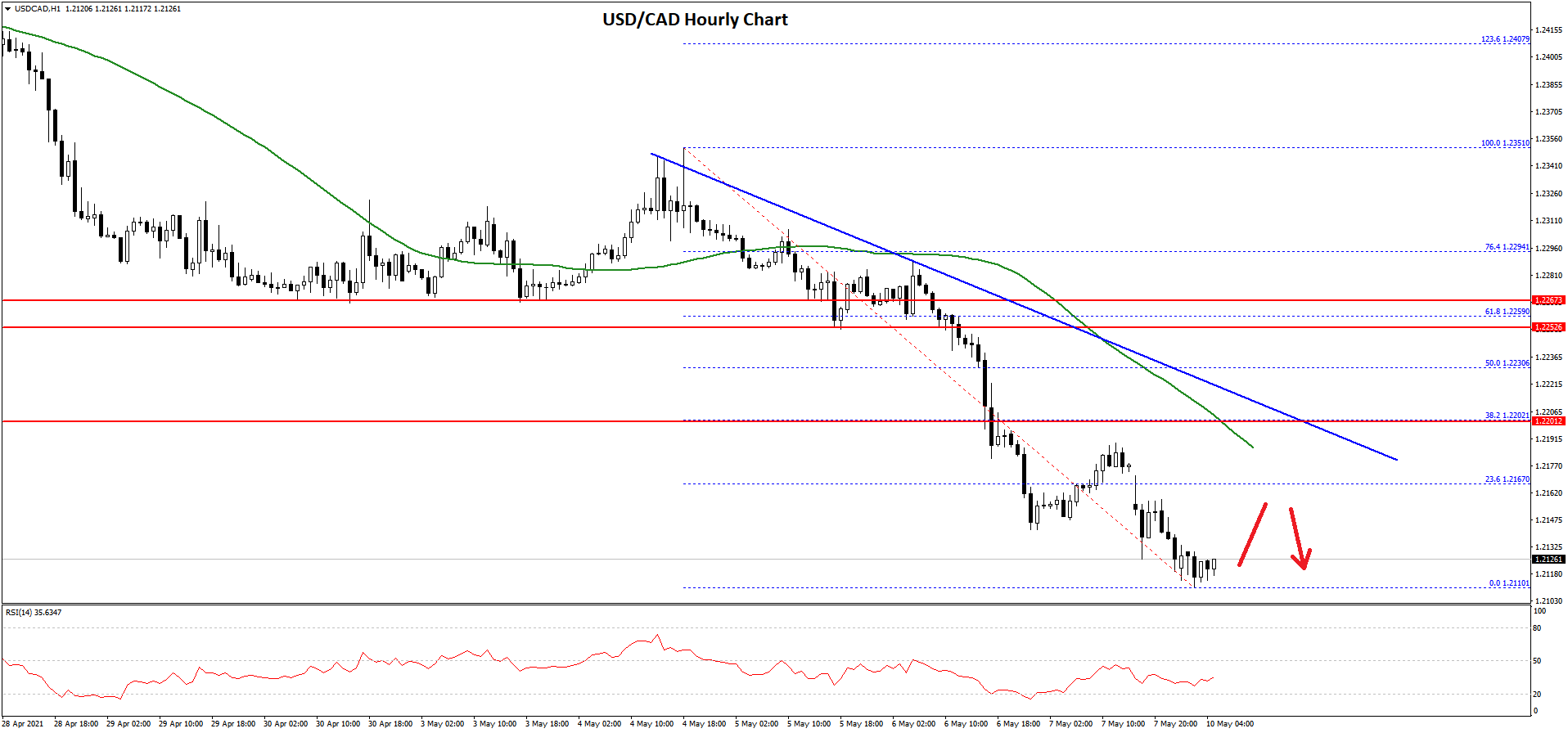 There was also a break below the 1.2200 support zone and close below the 50 hourly simple moving average. The pair traded as low as 1.2110 and it is now consolidating losses.