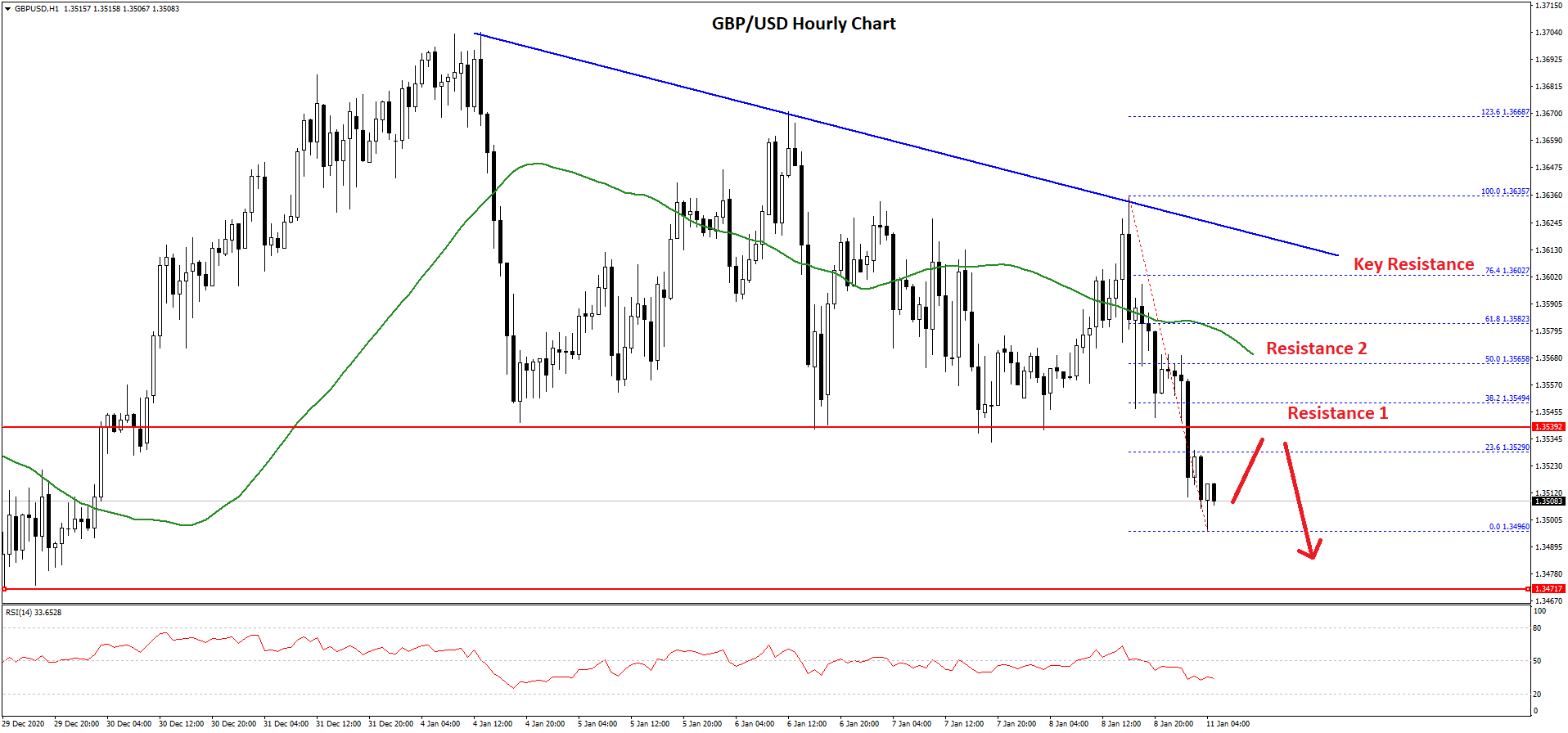 Finally, there is a major bearish trend line forming with resistance near 1.3610 on the hourly chart of GBP/USD. Clearly, the pair is likely to face many hurdles if it starts an upside correction from the recent low of 1.3496.