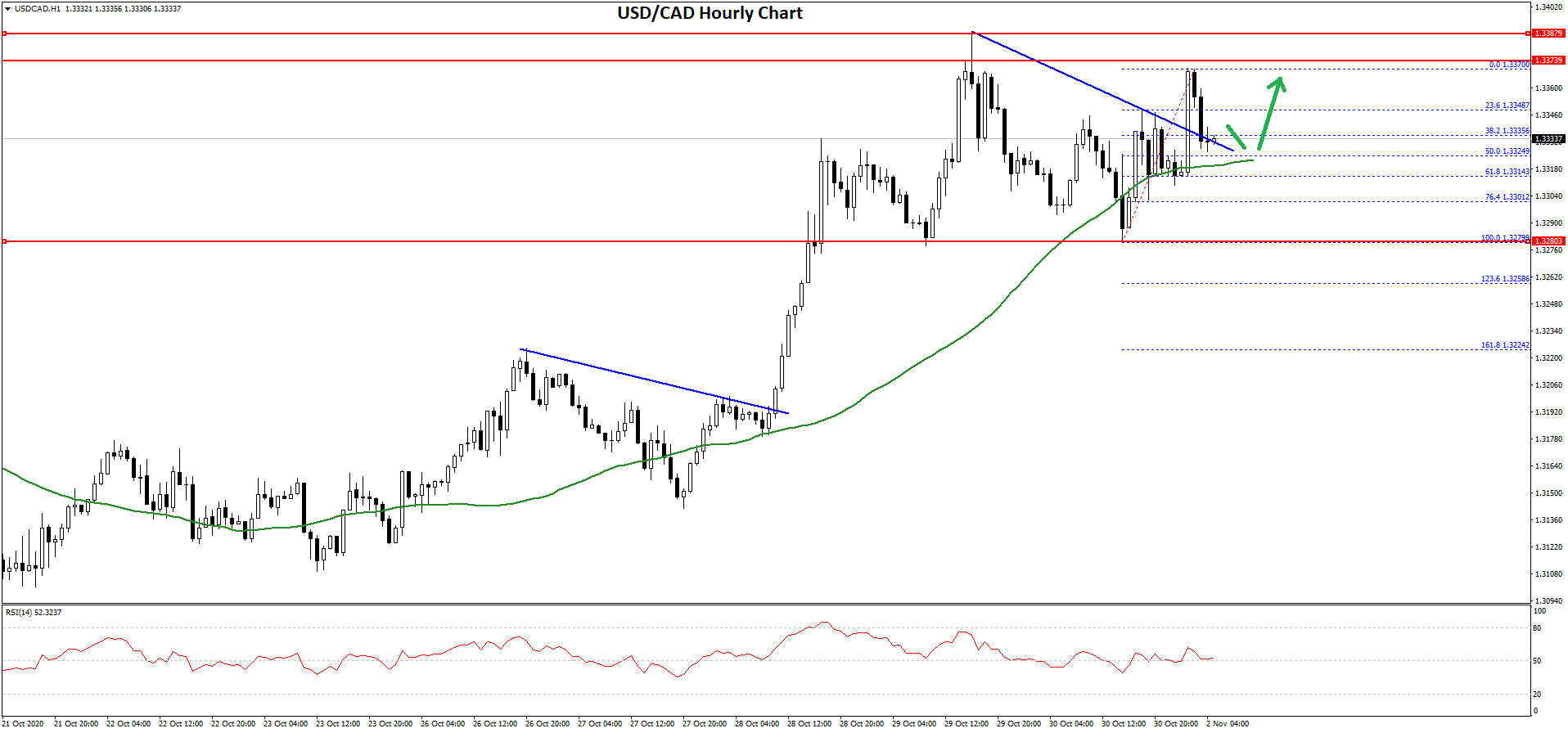 On the downside, the 1.3300 and 1.3280 levels are acting as strong supports. Recently, there was a break above a connecting bearish trend line with resistance near 1.3335 on the hourly chart. The pair is currently consolidating gains near the broken trend line at 1.3340.