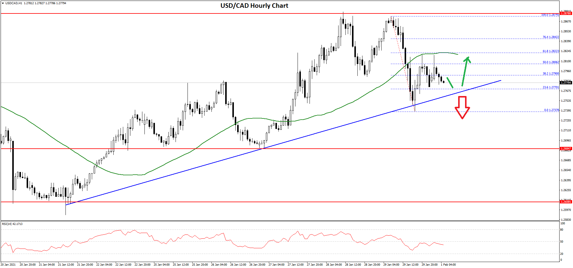 On the downside, there is a major bullish trend line forming with support near 1.2770 on the hourly chart. If USD/CAD breaks the trend line support, there is a risk of a larger decline in the coming sessions.