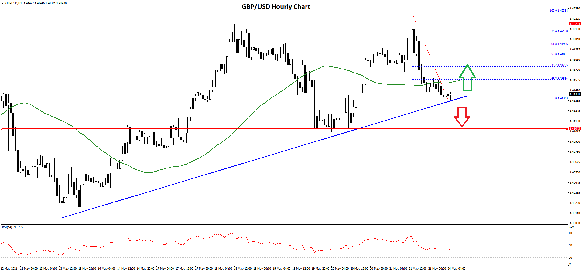- There is a major bullish trend line forming with support near 1.4135 on the hourly chart of GBP/USD.