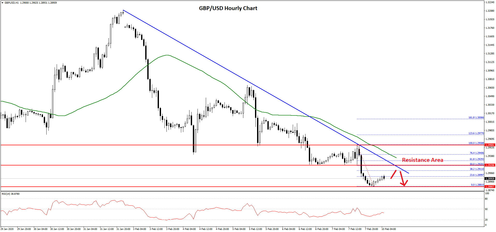- There is a major bearish trend line forming with resistance near 1.2910 on the hourly chart of GBP/USD.