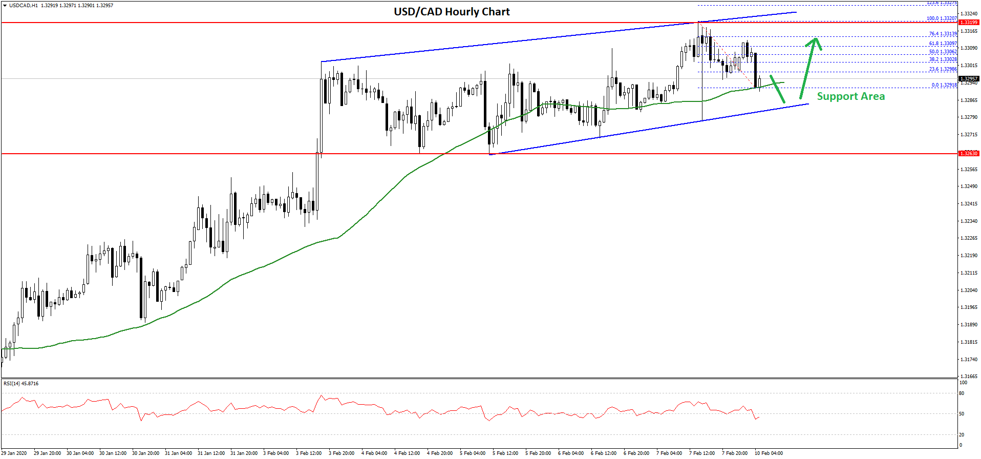 On the downside, an immediate support is near the 1.3190 level. Moreover, there is a rising channel forming with support near 1.3285 on the hourly chart.