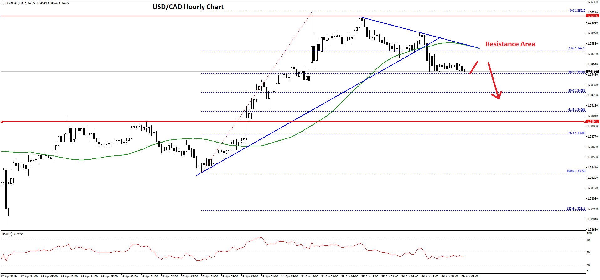 Any further declines may push USD/CAD towards the 1.3400 support level. On the upside, an initial resistance is near the 1.3480 level, the 50 hourly SMA, and a connecting bearish trend line.