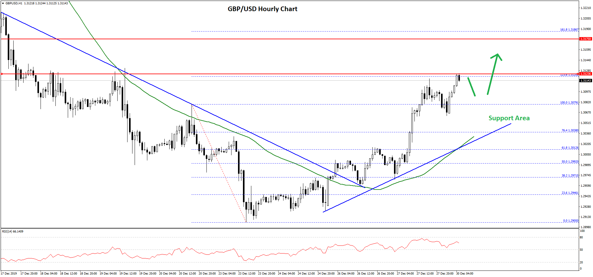 The pair broke the 1.3100 support area and the 50 hourly simple moving average and 1.3160. Moreover, there was a break below a key bullish trend line with support near 1.3155 on the hourly chart.