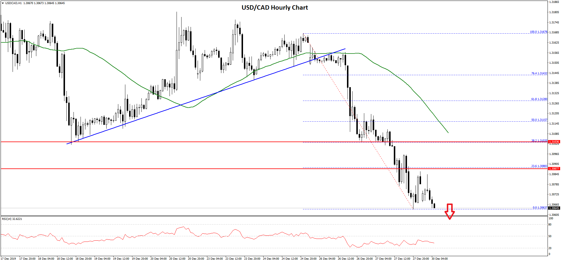 - USD/CAD is declining and it is now trading well below the 1.3100 support area.
