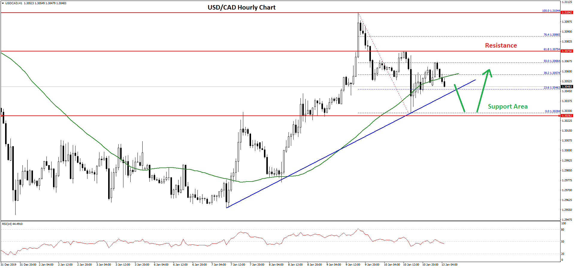 A high was formed near 1.3104 and recently the pair started a downside correction. There was a break below the 1.3050 support, but the pair found support near the 1.3030 level.