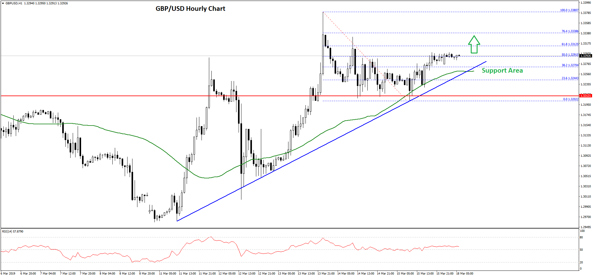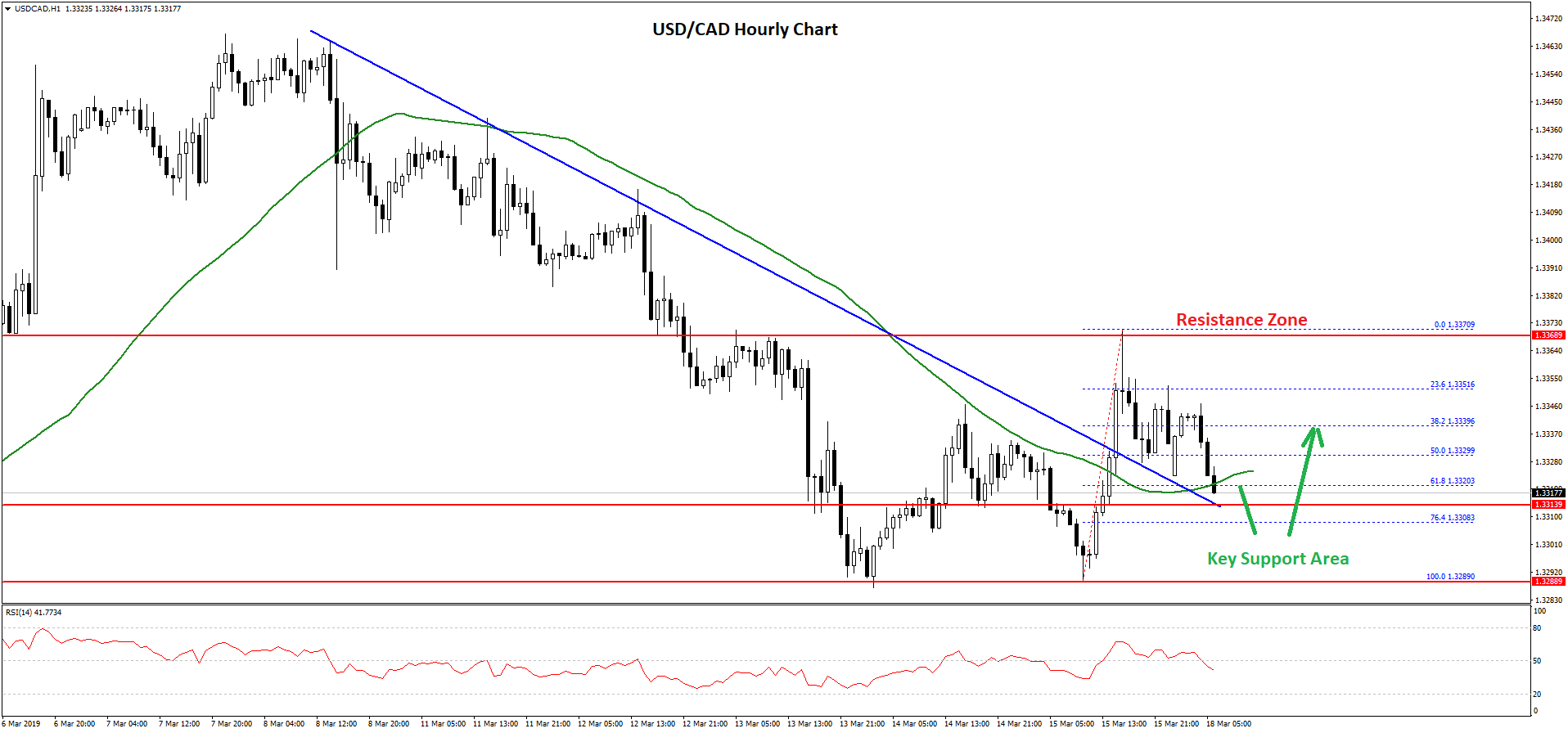 A low was formed at 1.3289 and later the pair formed a solid support base near the 1.3300 level. Finally, there was an upside break above 1.3320 level and a key bearish trend line with resistance at 1.3330 on the hourly chart.