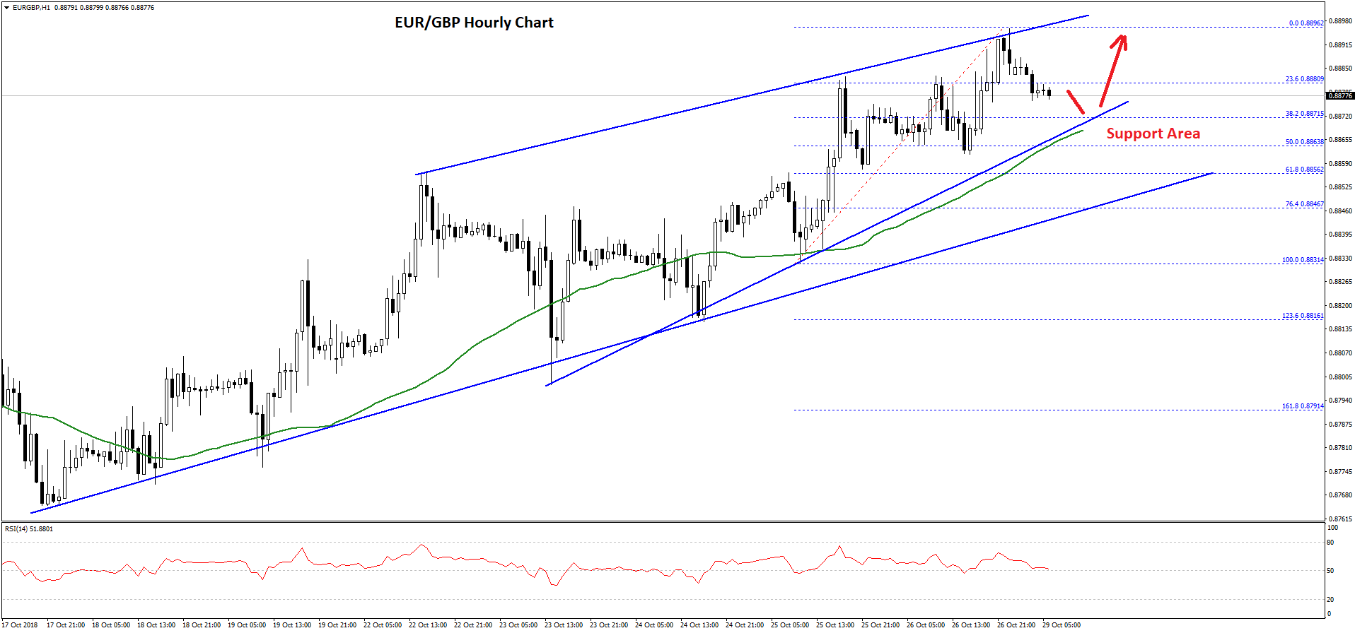 Later, there was a downside correction and the pair declined below the 0.8885 level. It also broke the 23.6% Fib retracement level of the last wave from the 0.8831 low to 0.8896 high. However, there are many important supports on the downside near the 0.8870 level.