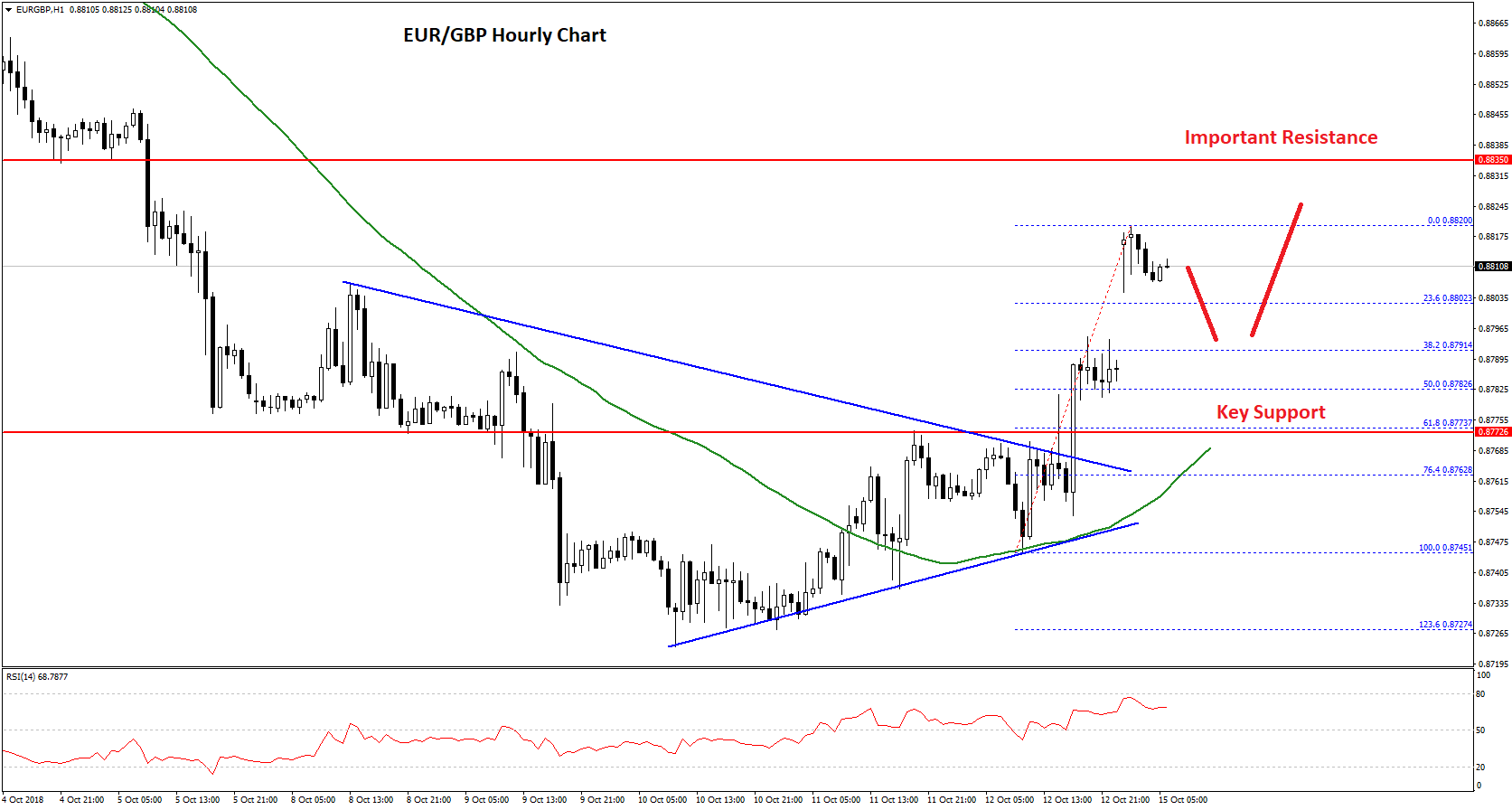 To climb higher, there was a break above a contracting triangle with resistance at 0.8765 on the hourly chart. It opened the doors for more gains and the pair broke the 0.8800 resistance. The pair traded as high as 0.8820 and it is currently consolidating gains.