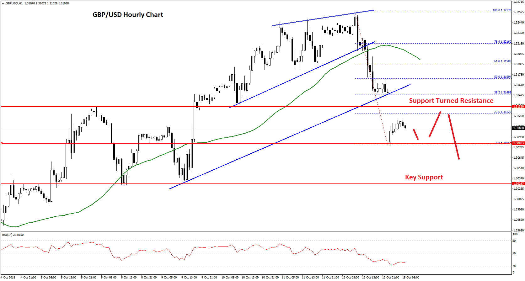 The pair started a downside move after forming a top near the 1.3257 level. It declined below the 1.3200 support area and broke the 50 hourly simple moving average.