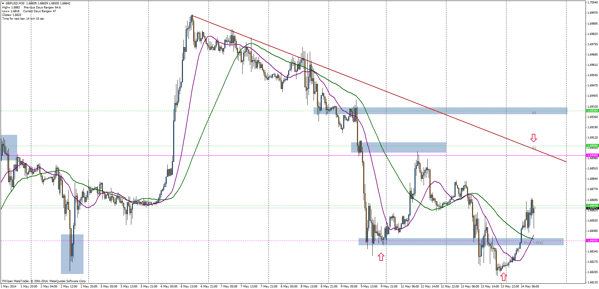 On lower Timeframe (30-minutes) we see quasi-double bottom near today's Pivot Point 1.6870 (also 2nd May low). Pair is now (GMT 8:00) approaching Pivot R1, but traders may want to wait till data publications for further move. 1.6900 seems decent key S/R level for further Price Action.