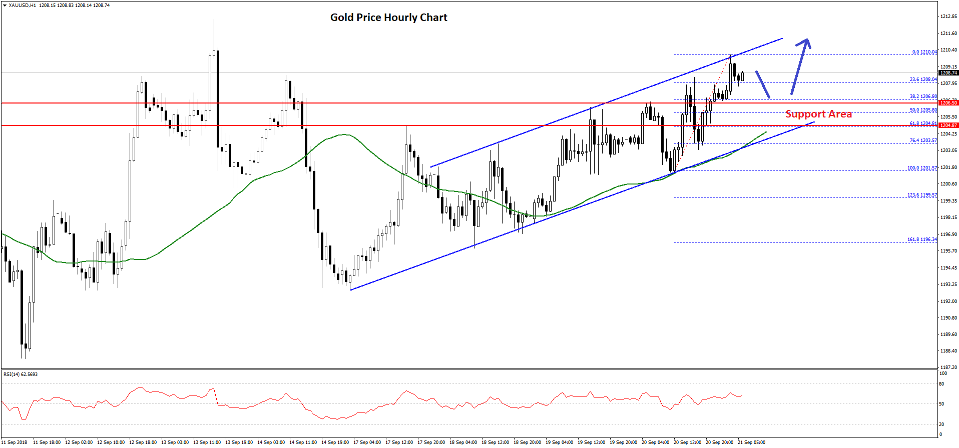 There was a nice upside move and the price even broke the $1,205 resistance and the 50 hourly simple moving average. The price traded towards the $1,210 level and formed a high at $1,210.04.
