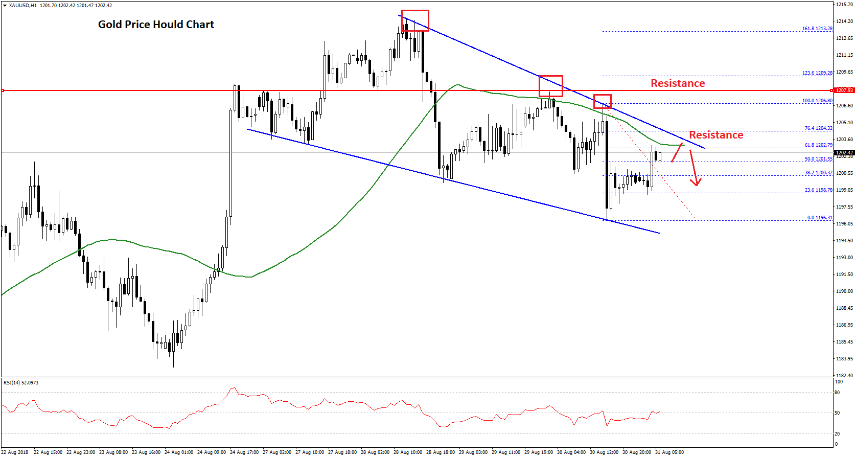 The decline was such that the price even broke the $1,200 support and settled below the 50 hourly simple moving average. It traded as low as $1,196.31 and later corrected higher. It moved above the 50% Fib retracement level of the last decline from the $1,206.80 high to $1,196.31 low.