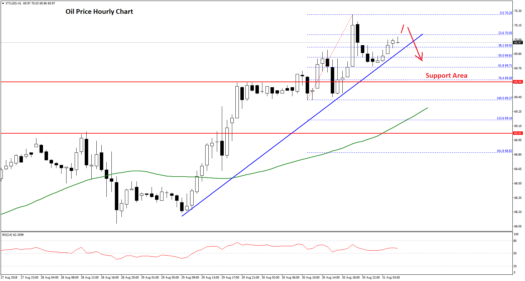 The price traded towards the $70.25 level and settled above the 50 hourly simple moving average. A high was formed at $70.26 before the price started a downside correction. It moved down and broke the $70.00 support.