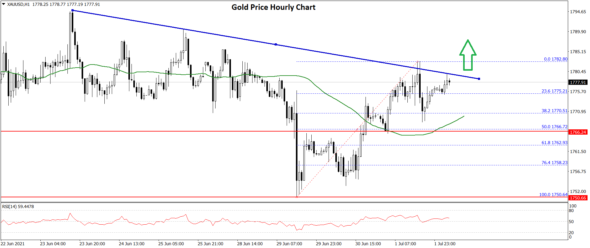 The price even settled above the $1,765 level and the 50 hourly simple moving average. However, the price seems to be facing a strong resistance near the $1,780 zone. There is also a key bearish trend line forming with resistance near $1,780 on the hourly chart of gold.