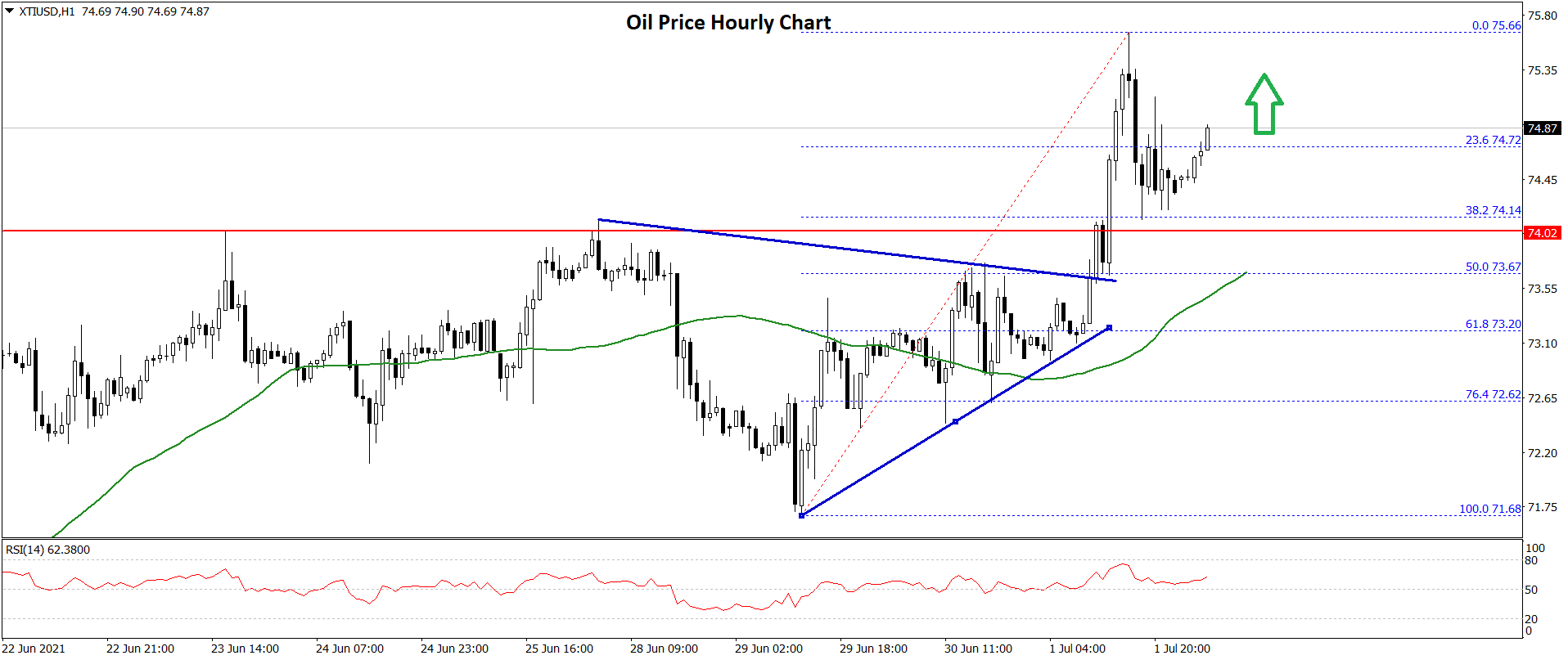 Gold price started a decent recovery wave from the $1,750 support. Crude oil price is rising and it is now trading nicely above the $74.00 level.