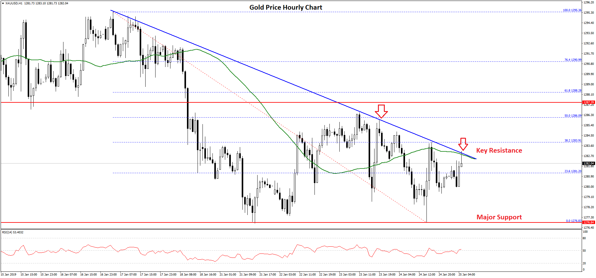However, the price is currently facing a monster resistance near the $1,285 level and the 50 hourly simple moving average. Moreover, there is a crucial bearish trend line in place with resistance at $1,283 on the hourly chart of gold.