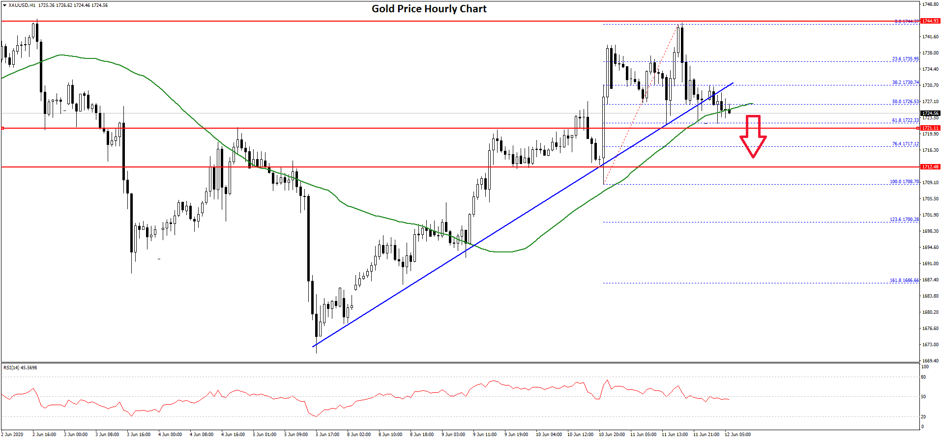 More importantly, there was a break below a key bullish trend line with support near $1,726 on the hourly chart of gold. The price is now testing the $1,724 and $1,722 support levels.