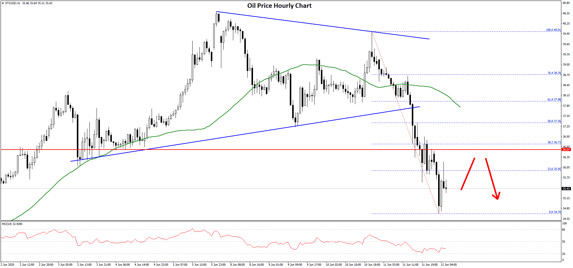 Crude oil price started a major decline from well above the $40.00 level against the US Dollar. The price broke many key supports near $38.00 and $37.50 to move into a bearish zone.