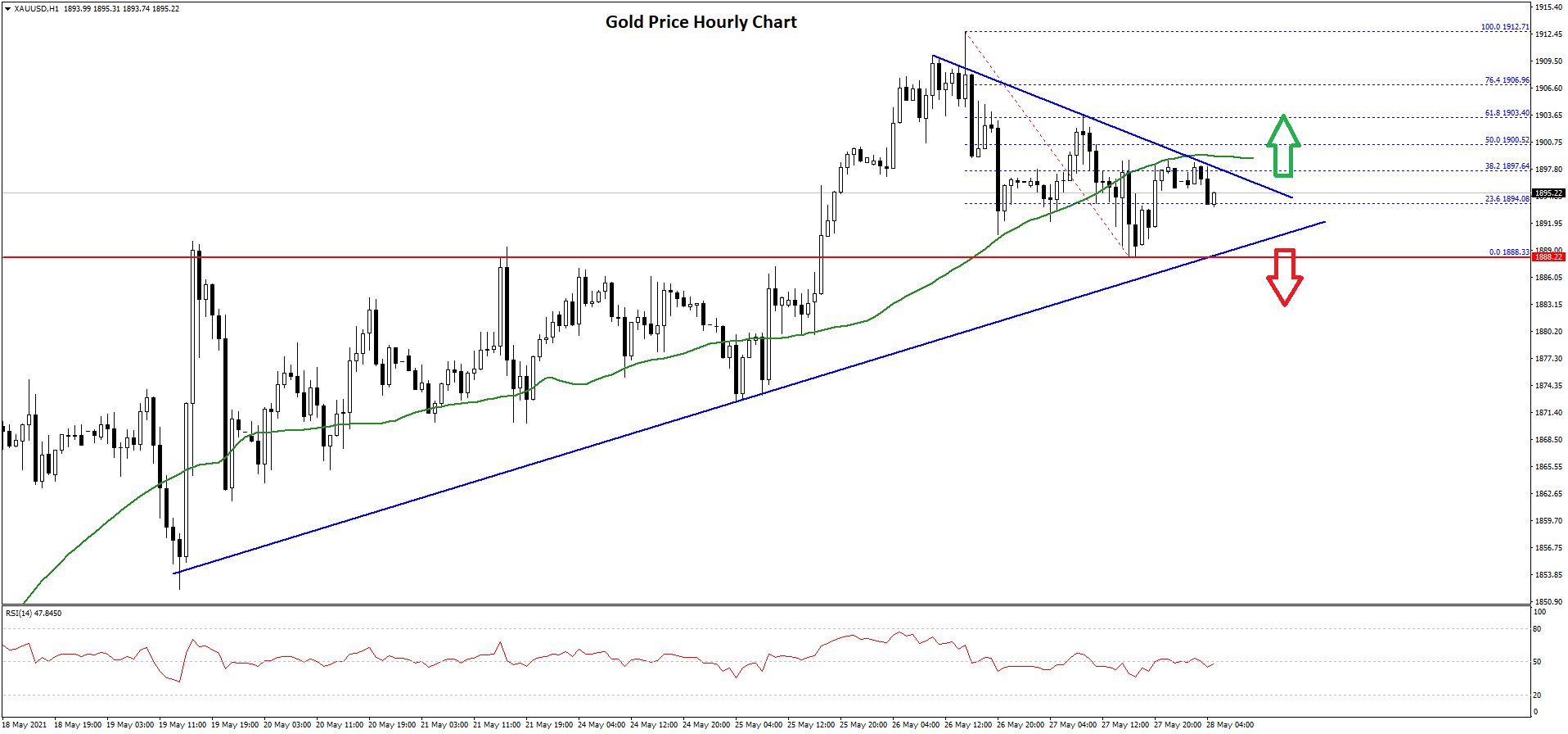 The triangle resistance is near the 38.2% Fib retracement level of the recent decline from the $1,912 high to $1,888 low. The main resistance is now forming near the $1,900 level and the 50 hourly simple moving average.