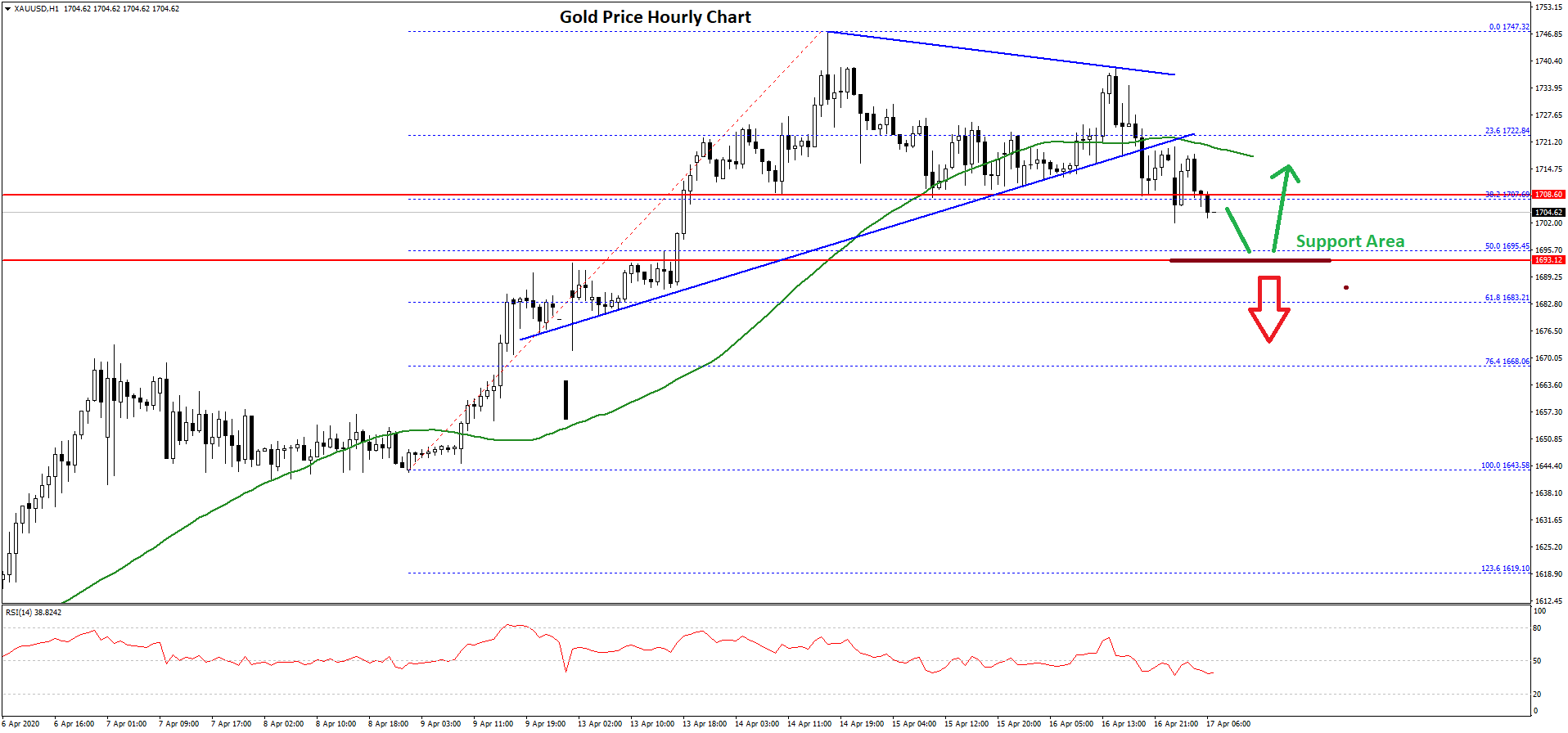 There was a break below the 38.2% Fib retracement level of the recent rally from the $1,643 low to $1,747 high. Moreover, there was a break below a key contracting triangle with support near $1,720 on the hourly chart of gold.
