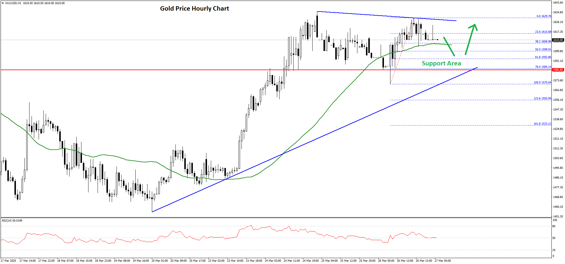 The price is currently correcting lower below $1,620. There was a break below the 23.6% Fib retracement level of the recent rise from the $1,570 low to $1,629 high.