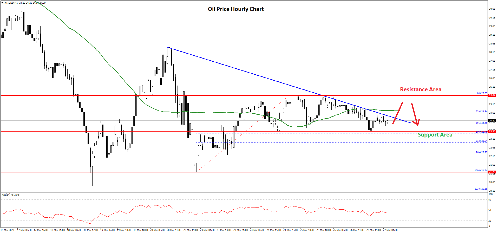- Crude oil price is still trading below the main $25.00 and $25.70 resistance levels.
