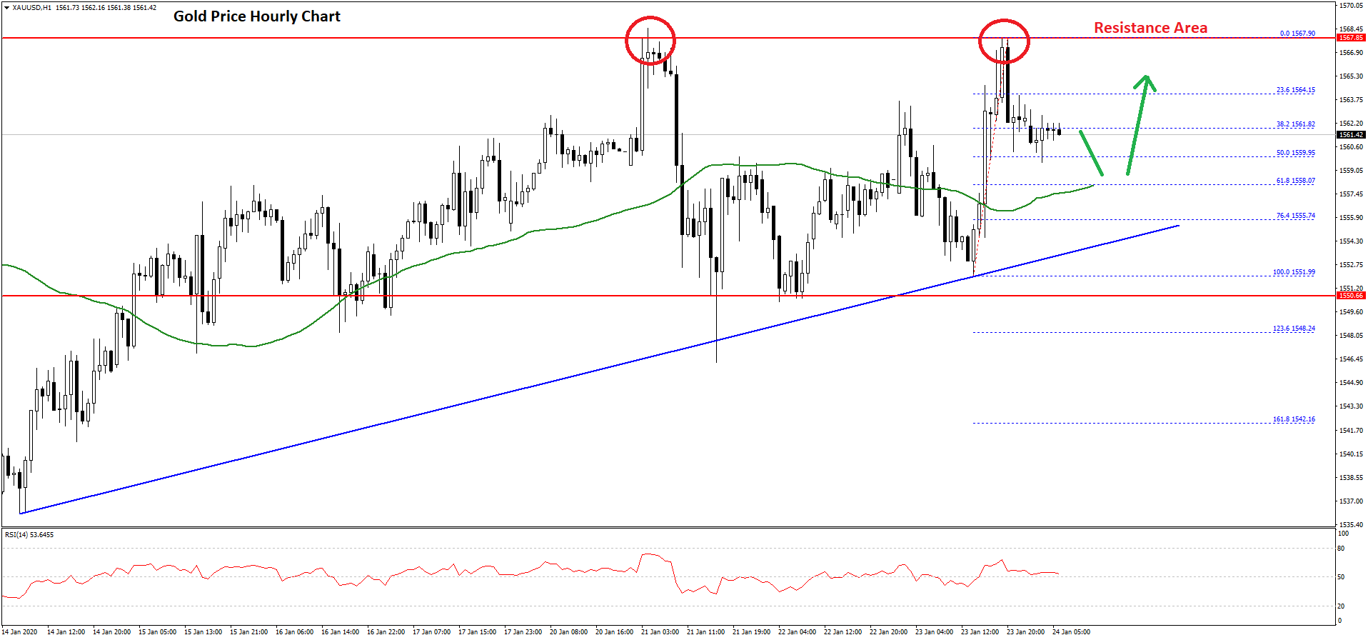 More importantly, there is a major bullish trend line forming with support near $1,555 on the hourly chart of gold. Therefore, dips remain well supported on the downside near the $1,558 and $1,555 levels.
