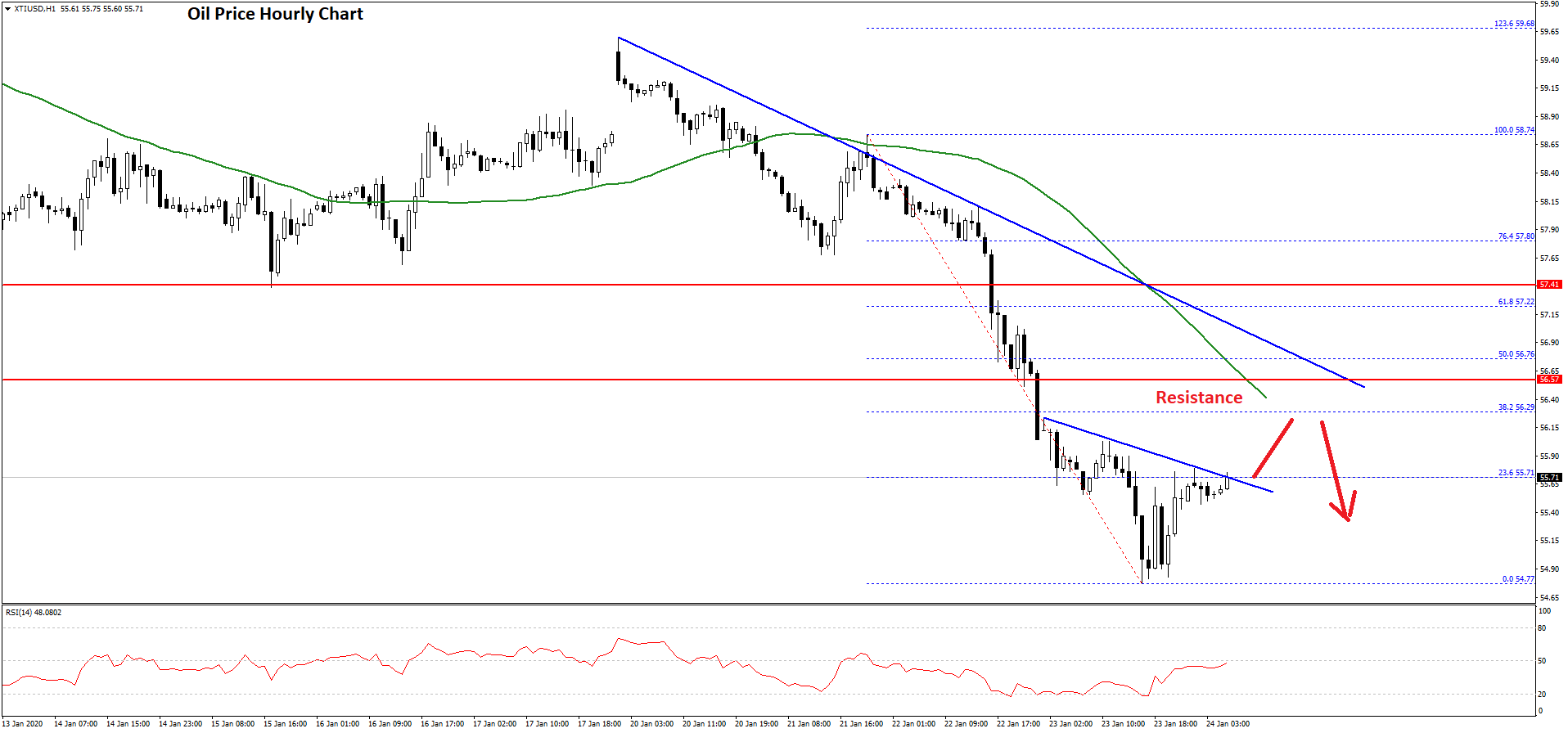- There is a key bearish trend line forming with resistance near $56.60 on the hourly chart of XTI/USD.