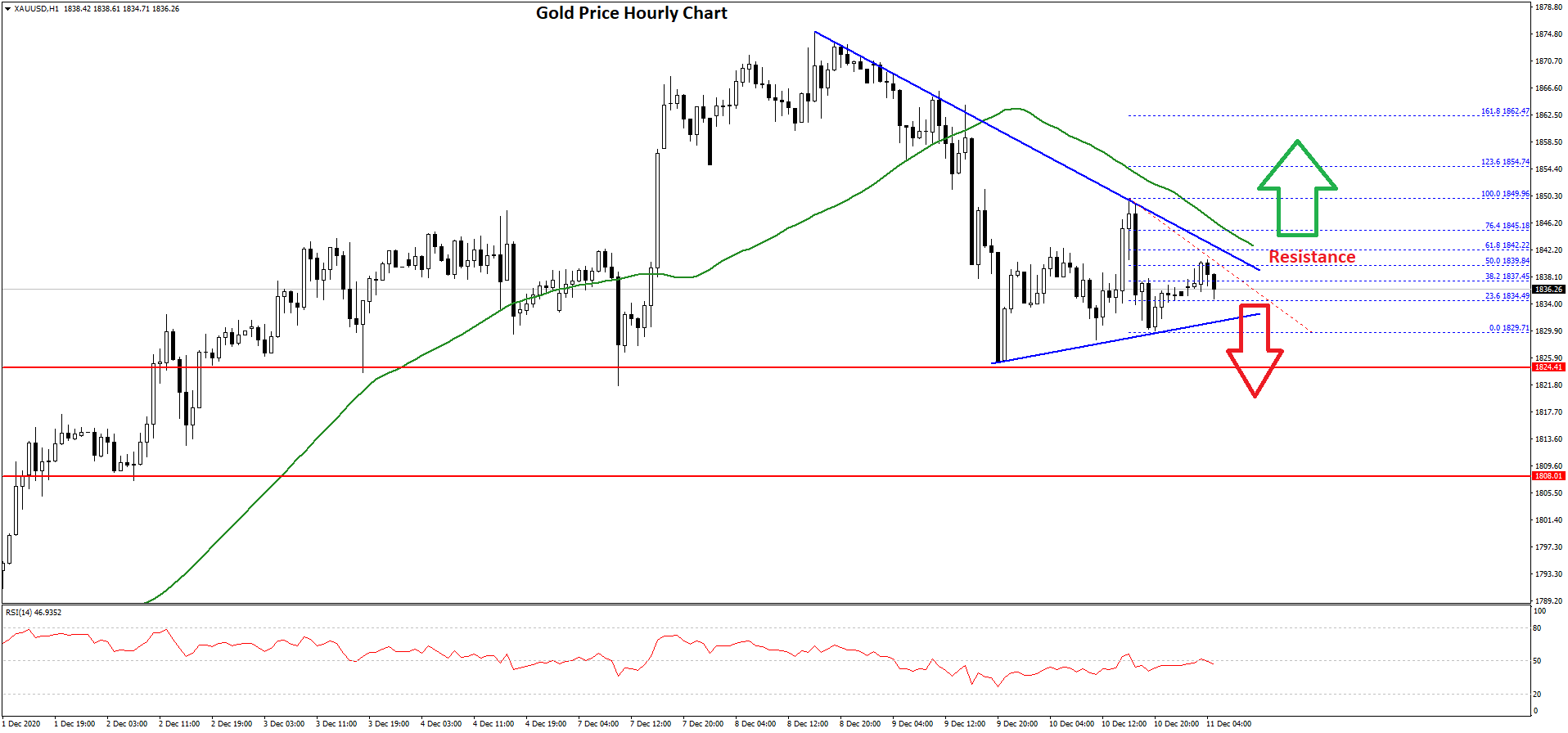 The price even broke the $1,840 level and traded close to $1,825. The price is currently consolidating above $1,825. The recent swing high was near $1,849 before the price declined to $1,829.