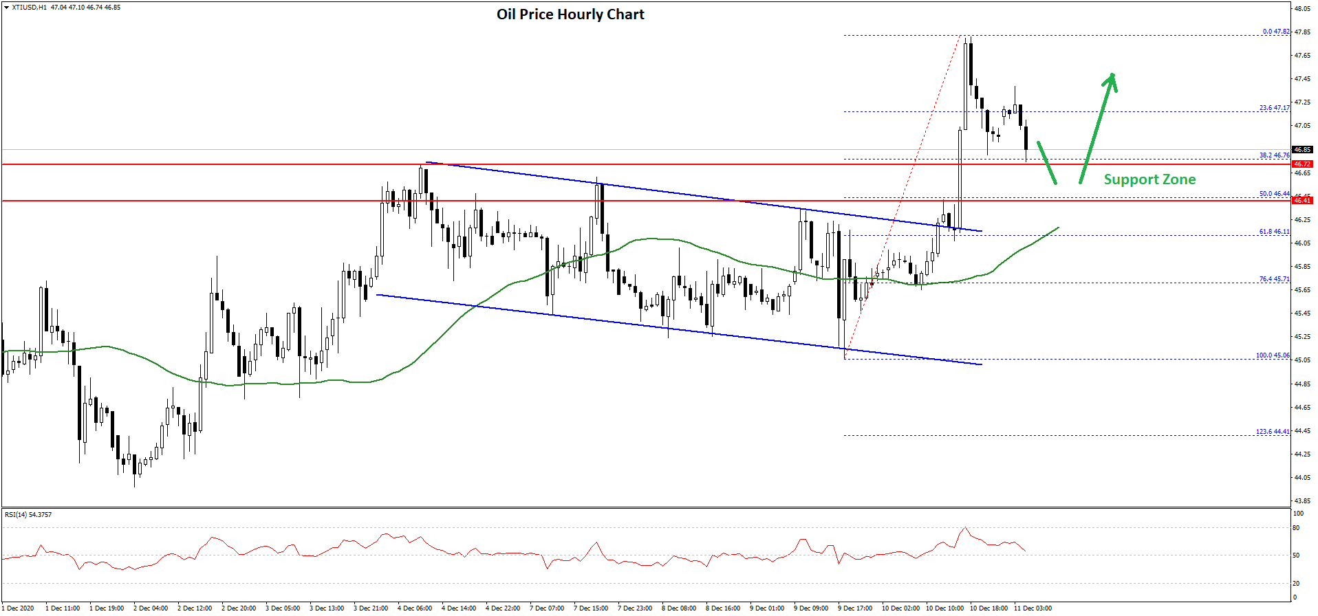 On the upside, the price is facing hurdles near the $47.25 level. A close above $47.25 might set the pace for a fresh leg higher towards the $48.00 level.