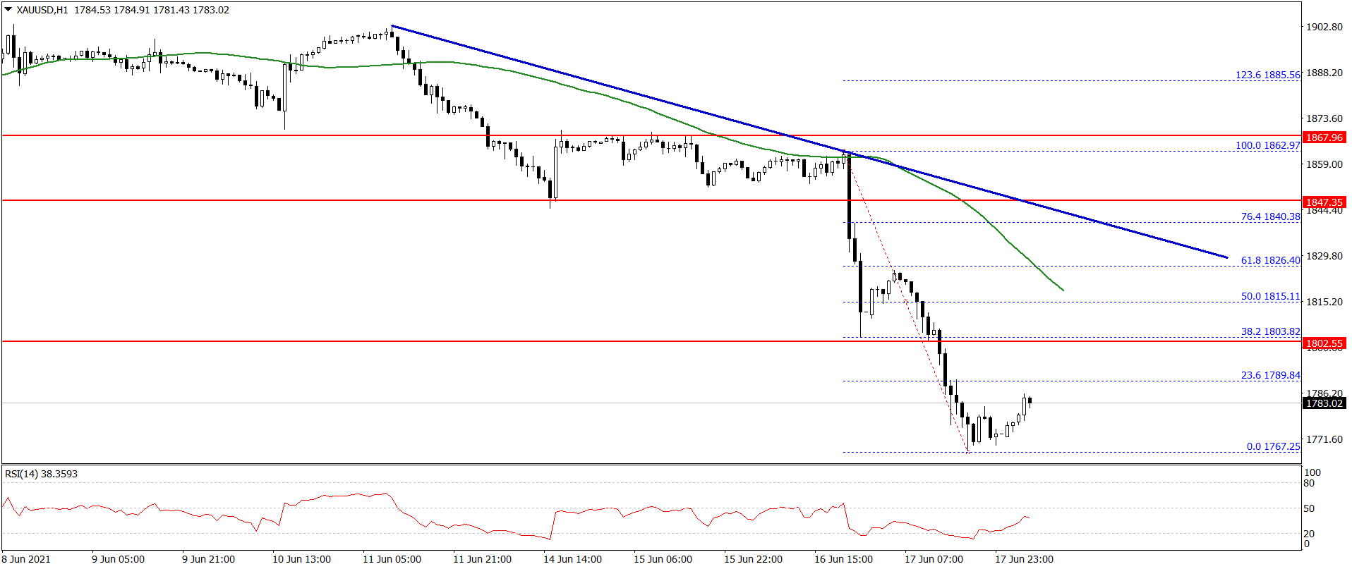 The price even settled below the $1,850 level and the 50 hourly simple moving average. There was a break below the $1,820 support and $1,800. A low is formed near $1,762 on FXOpen and the price is now correcting losses.