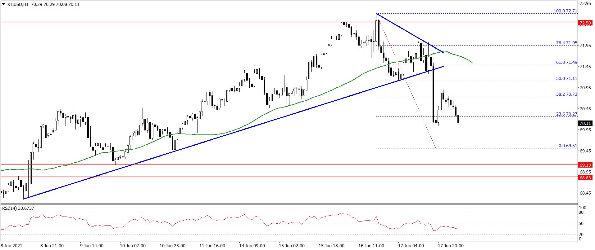 - There was a break below a major bullish trend line with support near $71.20 on the hourly chart of XTI/USD.