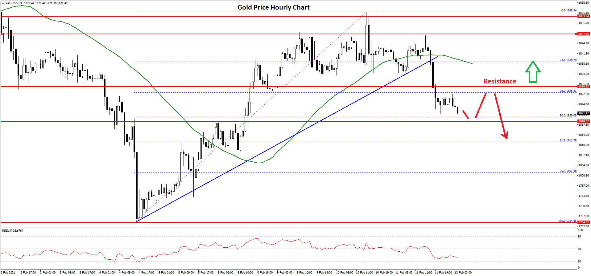 However, the price struggled to clear the $1,855 and $1,860 resistance levels. A high was formed near $1,855 before the price started a fresh decline. There was a break below the $1,840 level and the 50 hourly simple moving average.