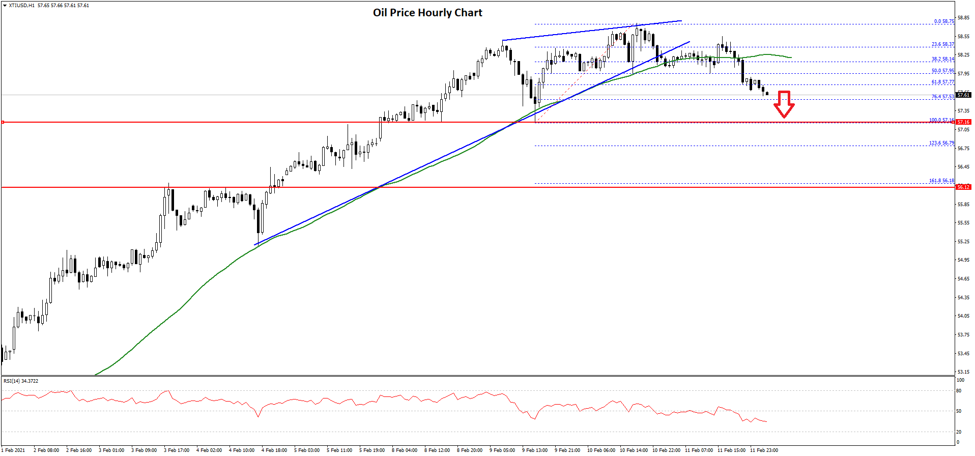 It traded to a new multi-month high near $58.75 before it started a downside correction. There was a break below the $58.40 and $58.20 support levels.