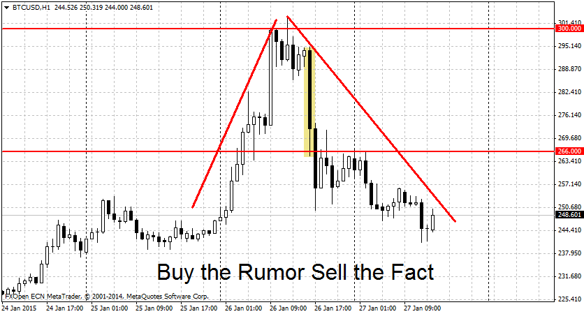 The initial Coinbase announcement was planned for 9 AM EST. The company even made a special webpage for the launch called Lunar, with a caption that said only ‘’To The Moon’’ and a timer set to run out on January 26th at 9 AM. But for whatever reason, the Wall Street Journal was given the story almost a day early and published the news ahead of time. This led to a rally across the board. Then as 9 AM rolled around in a classic ‘’buy the rumor sell the fact’’ BTC/USD got sold aggressively. Prices fell from $294 to a low of $250 in two short hours.