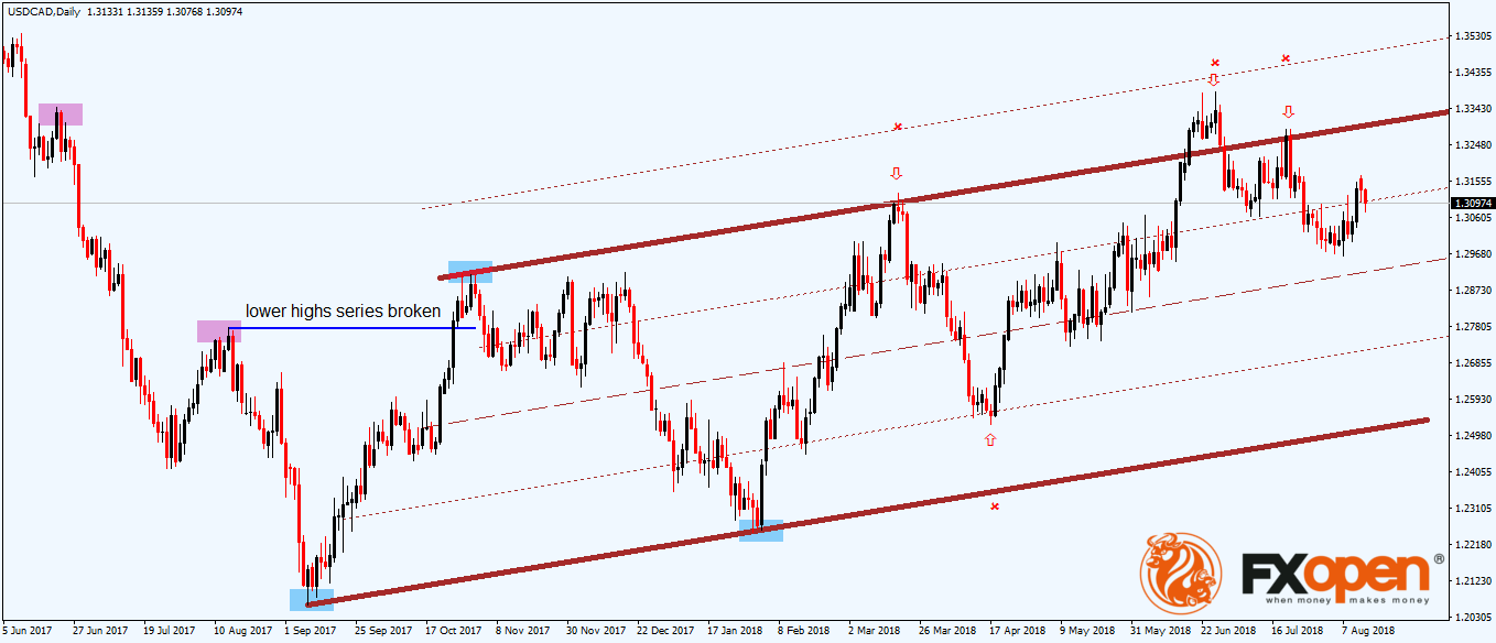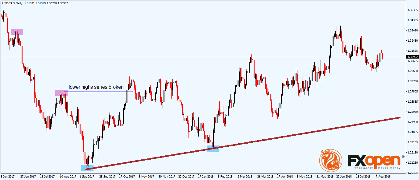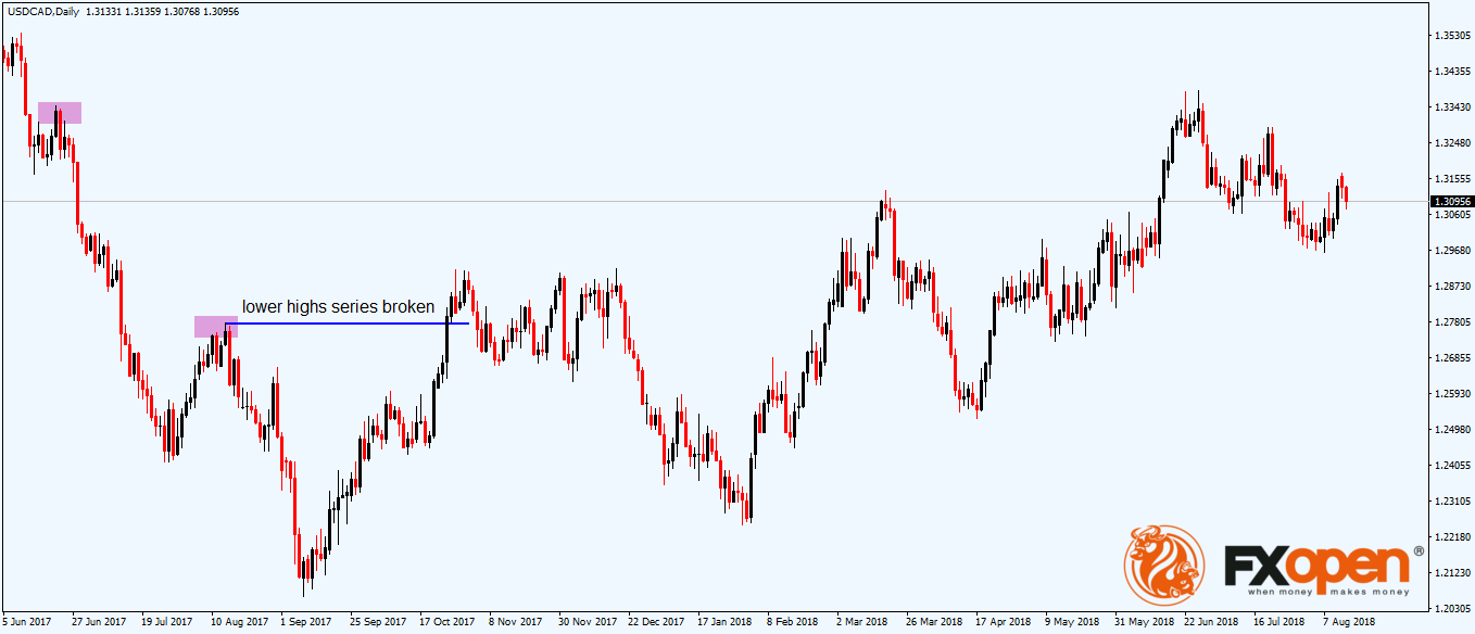 The USDCAD daily chart from above shows the current price action on one of the most popular currency pairs in retail Forex trading. The two rectangular shapes on the left side of it show the bearish market’s characteristics: lower lows and lower highs.
