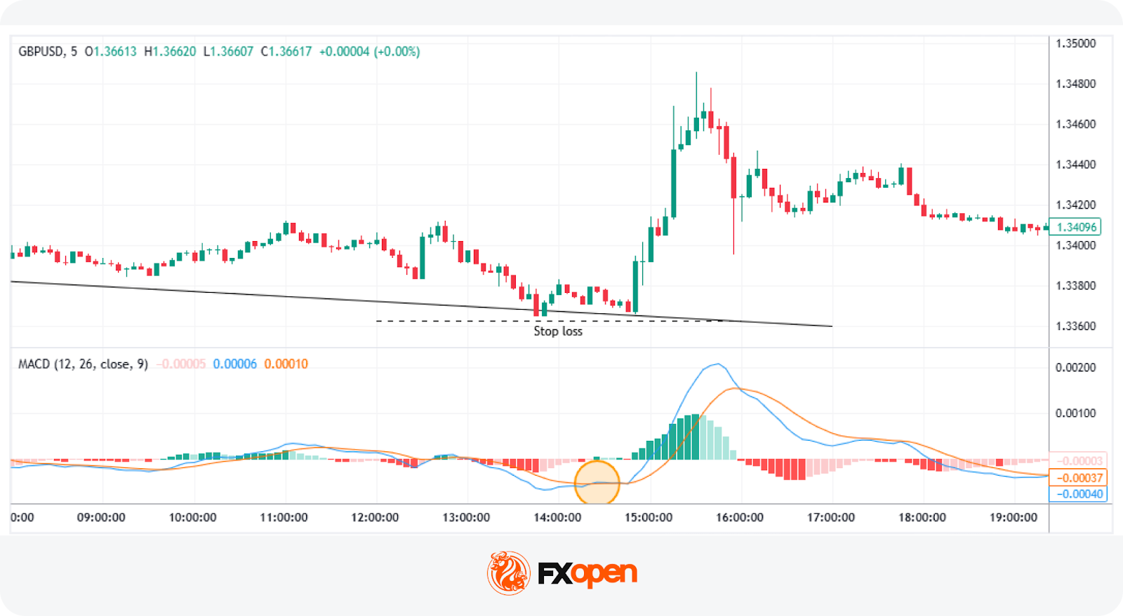 If a trader had chosen to be more conservative, the 5-minute chart would have shown a MACD crossover that confirmed the pin bar and added additional confluence.