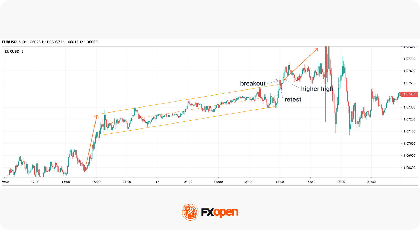 A breakout is confirmed by three points. First, the price needs to surpass the boundary. Second, it needs to retest the boundary. Finally, a trade can be opened on the third confirmation, which comes in the form of a price surpassing the breakout high in an upward movement and the breakout low in a downward movement. Only then can we be sure that a breakout is confirmed and enter a trade with confidence.