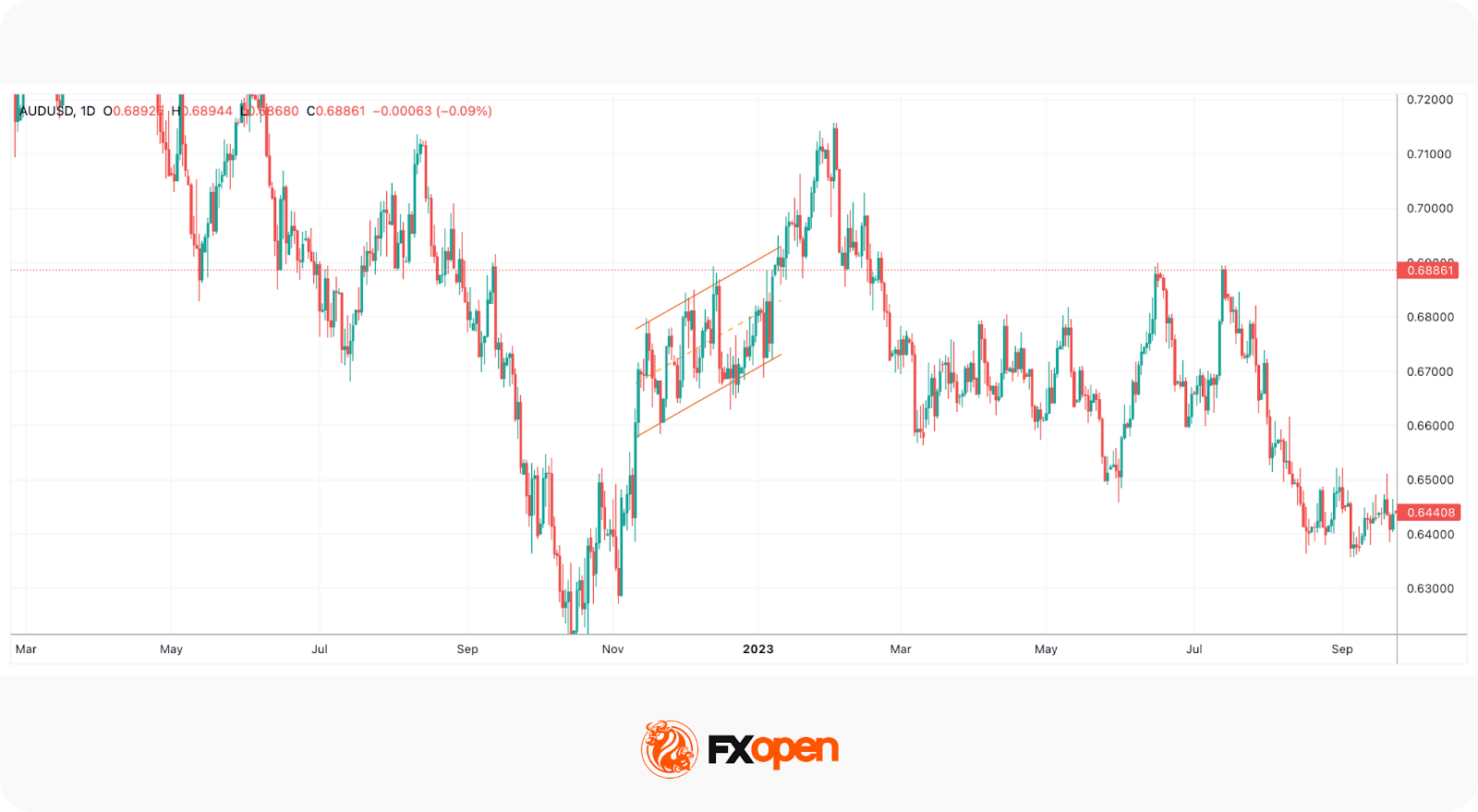 The daily chart of the AUD/USD pair shows that after an impulsive move to the upside, the price started consolidating before the uptrend continued. This brief pause in the trend is the rising channel.